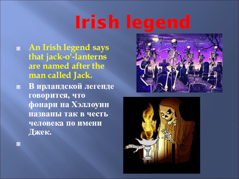 Irish legendAn Irish legend says that jack-o'-lanterns are named after the man called Jack.В