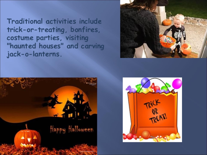 Слайд 3Traditional activities include trick-or-treating, bonfires, costume parties, visiting "haunted houses" and