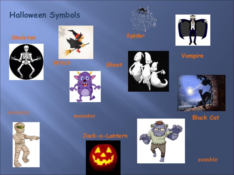 SpiderVampireWitchGhostSkeletonBlack CatJack-o-LanternHalloween Symbolsmonstermummyzombie