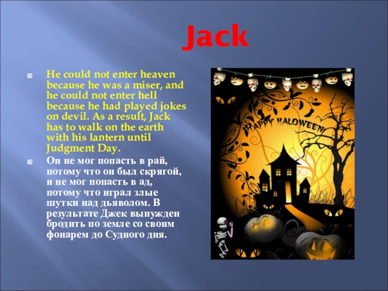 Он не мог попасть в рай, потому что он был скрягой, и не мог попасть в ад, потому что играл злые шутки над дьяволом. В результате Джек вынужден бродить по земле со своим фонарем до Судного дня.