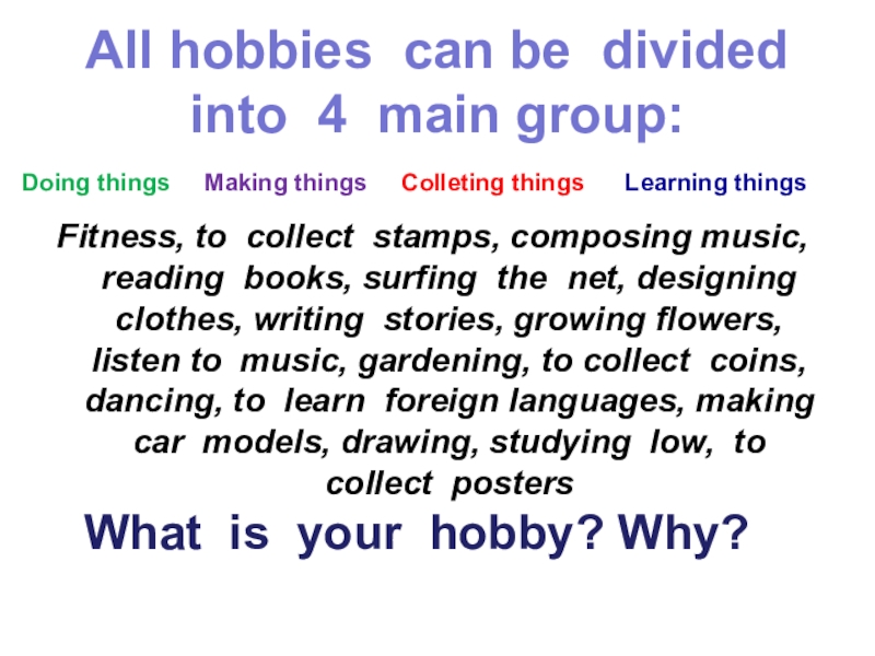 Sewing, knitting, collecting something (postcards, stamps, books,toys, pictures,dolls,toy soldiesrs watches), gardening, plaing musical instruments, play computer games, learing things. Some people are fond of travelling.
