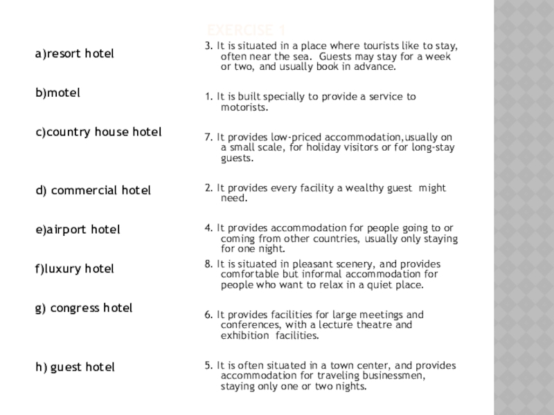 3. It is situated in a place where tourists like to stay, often near the sea. Guests may stay for a week or two, and usually book in advance.