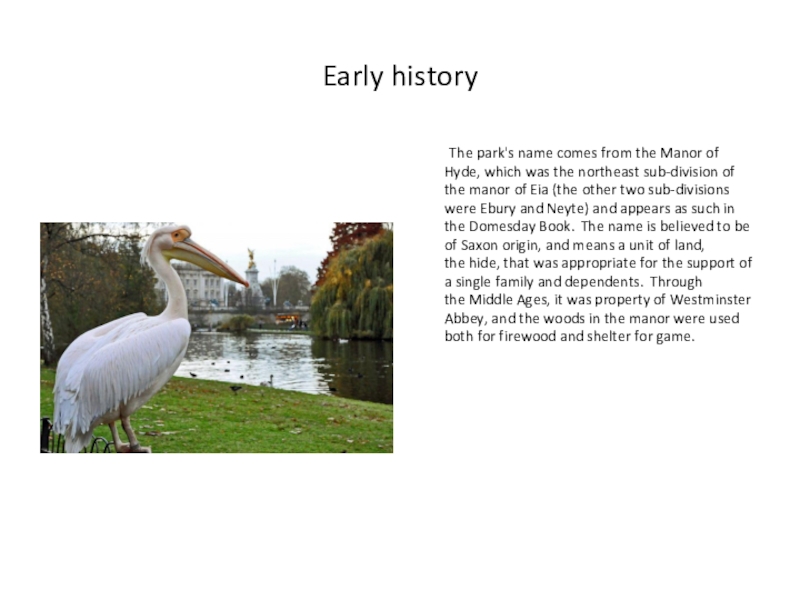 the Manor of Hyde, which was the northeast sub-division of the manor of Eia (the other two sub-divisions were Ebury and Neyte) and appears as such in the Domesday Book.  The name is believed to be of Saxon origin, and means a unit of land, the hide, that was appropriate for the support of a single family and dependents.  Through the Middle Ages, it was property of Westminster Abbey, and the woods in the manor were used both for firewood and shelter for game.