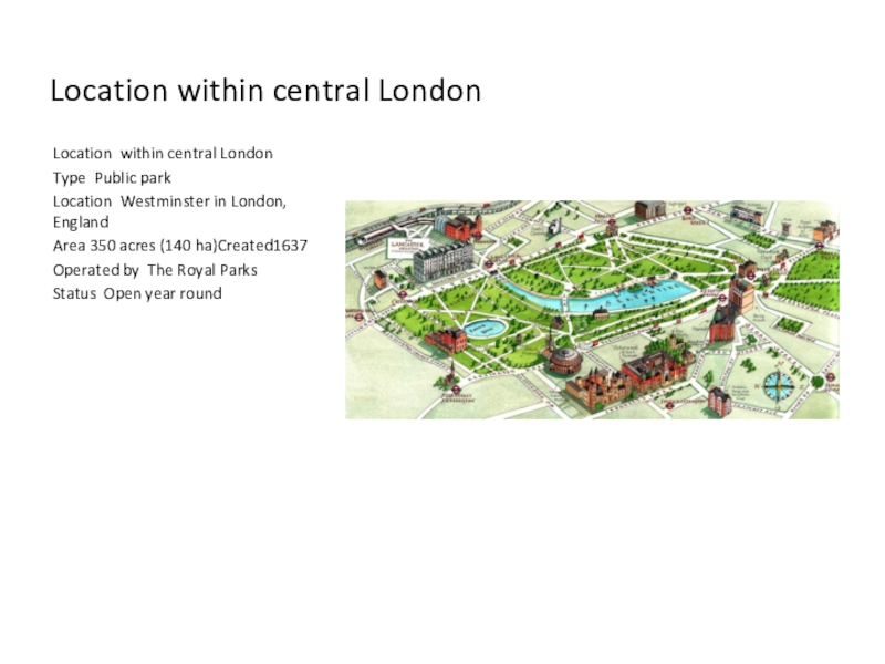 Location within central London Location within central LondonType Public parkLocation Westminster in London, EnglandArea 350 acres (140 ha)Created1637Operated by The Royal