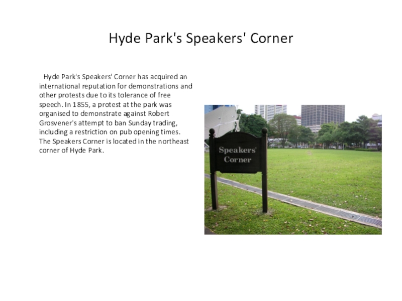 Speakers' Corner has acquired an international reputation for demonstrations and other protests due to its tolerance of free speech. In 1855, a protest at the park was organised to demonstrate against Robert Grosvener's attempt to ban Sunday trading, including a restriction on pub opening times. The Speakers Corner is located in the northeast corner of Hyde Park.