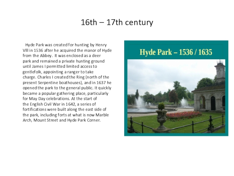 16th – 17th century      Hyde Park was created for hunting by Henry
