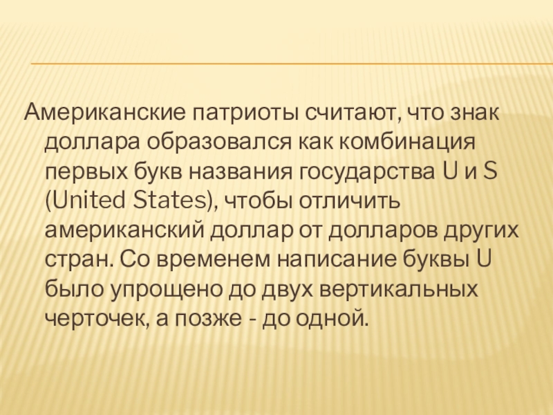 названия государства U и S (United States), чтобы отличить американский доллар от долларов других стран. Со временем написание буквы U было упрощено до двух вертикальных черточек, а позже - до одной.
