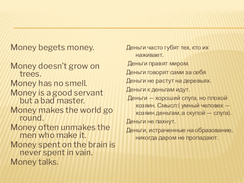 Деньги — хороший слуга, но плохой хозяин. Смысл:( умный человек — хозяин деньгам, а скупой — слуга).