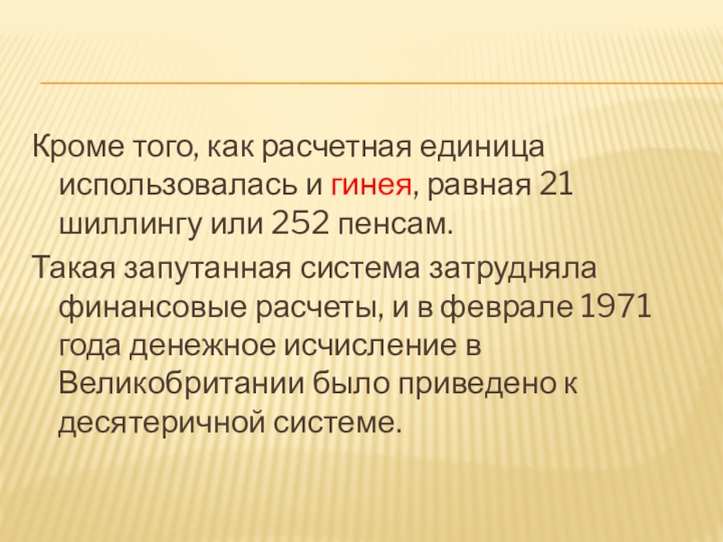 Слайд 9Кроме того, как расчетная единица использовалась и гинея, равная 21 шиллингу