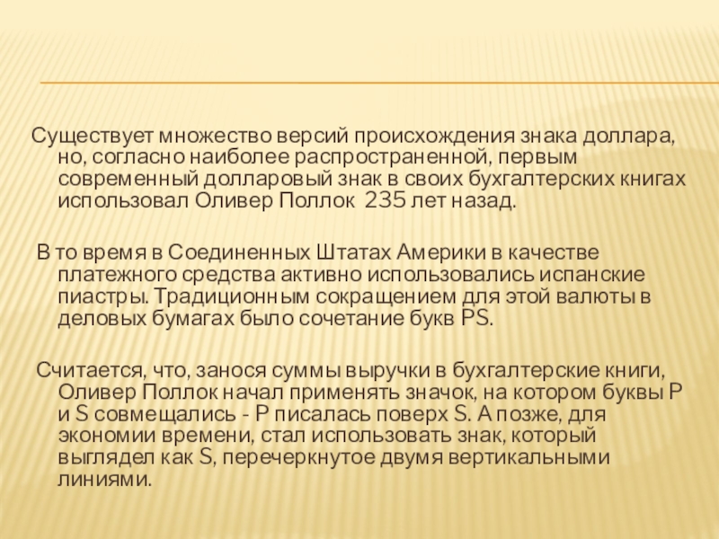 Слайд 20Существует множество версий происхождения знака доллара, но, согласно наиболее распространенной, первым
