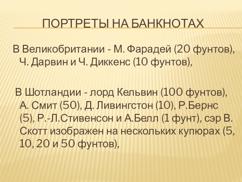 В Шотландии - лорд Кельвин (100 фунтов), А. Смит (50), Д. Ливингстон (10), Р.Бернс (5), Р.-Л.Стивенсон и А.Белл (1 фунт), сэр В.Скотт изображен на нескольких купюрах (5, 10, 20 и 50 фунтов),