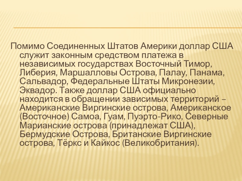 Слайд 18Помимо Соединенных Штатов Америки доллар США служит законным средством платежа в