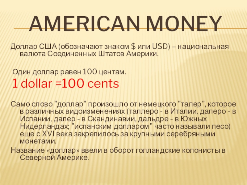 Доллар США (обозначают знаком $ или USD) – национальная валюта