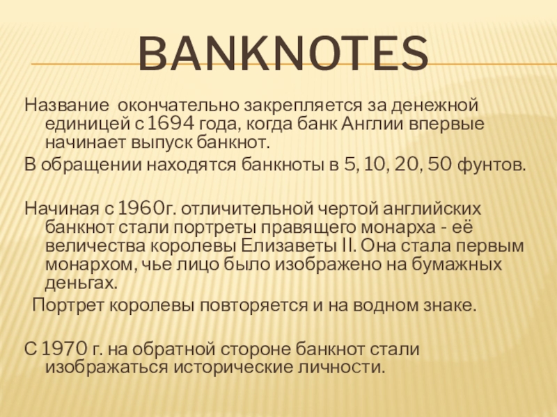 Начиная с 1960г. отличительной чертой английских банкнот стали портреты правящего монарха - её величества королевы Елизаветы II. Она стала первым монархом, чье лицо было изображено на бумажных деньгах.