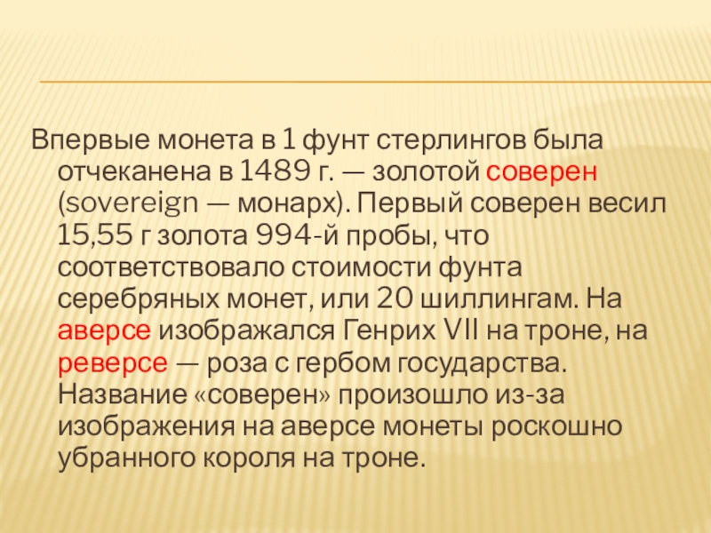 Слайд 5Впервые монета в 1 фунт стерлингов была отчеканена в 1489 г.