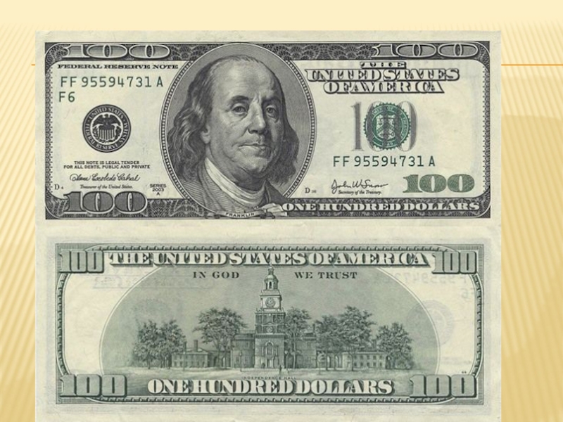 Учёный, публицист и дипломат Бенджамин Франклин (англ. Benjamin Franklin) — на банкноте в $100.