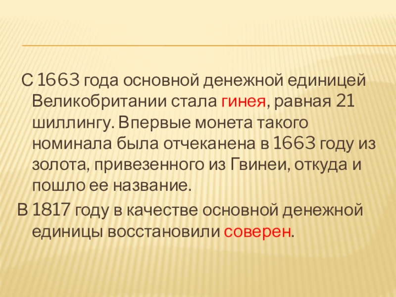 Слайд 7 С 1663 года основной денежной единицей Великобритании стала гинея, равная