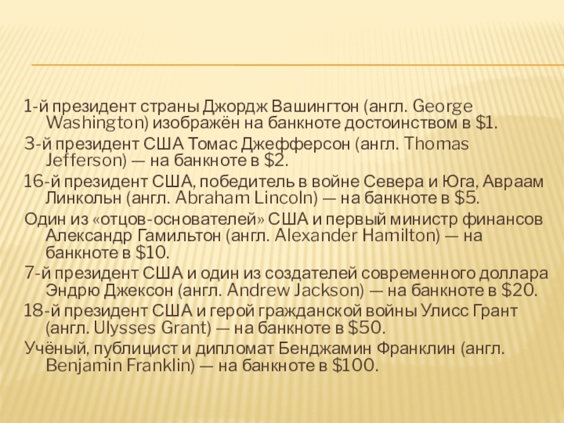 Слайд 271-й президент страны Джордж Вашингтон (англ. George Washington) изображён на банкноте