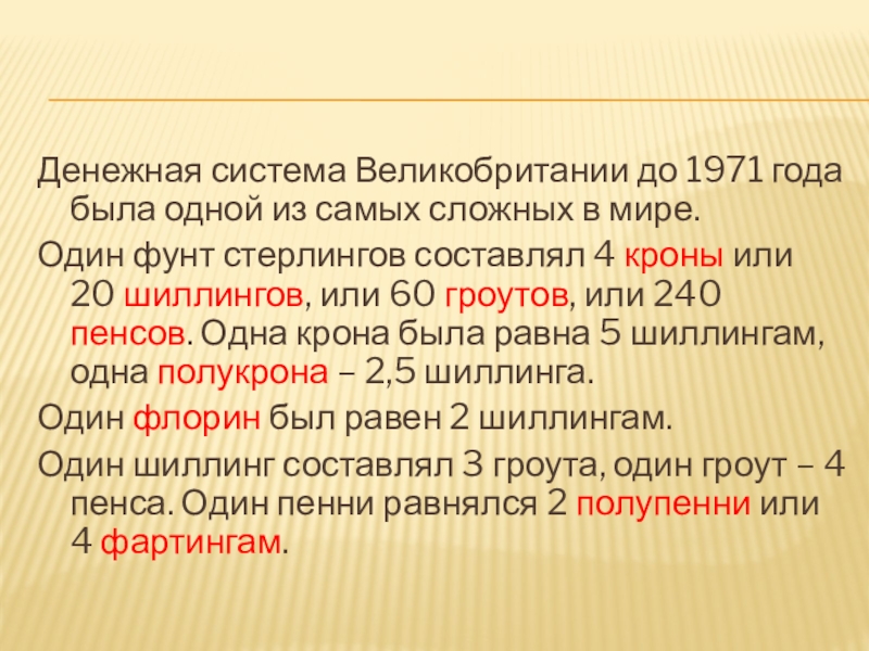 Слайд 8Денежная система Великобритании до 1971 года была одной из самых сложных