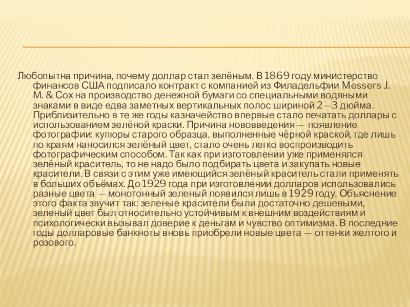 Слайд 29Любопытна причина, почему доллар стал зелёным. В 1869 году министерство финансов