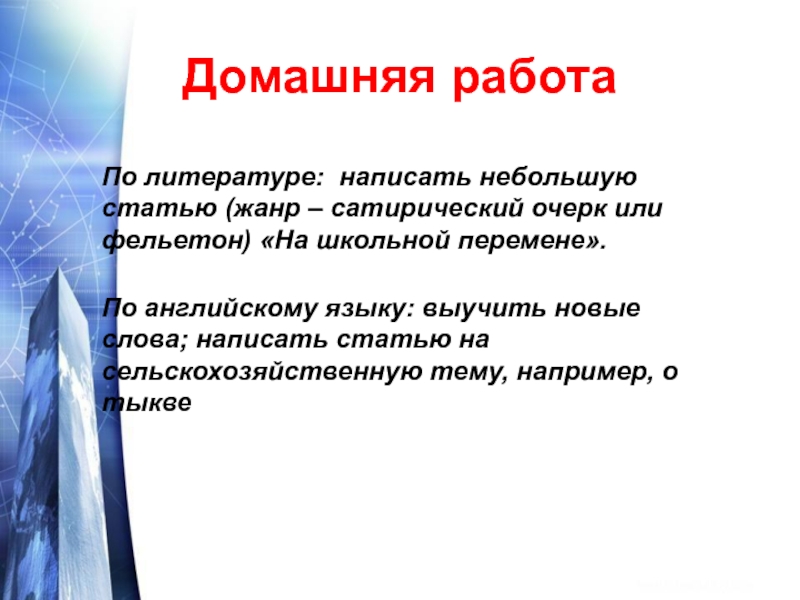 По английскому языку: выучить новые слова; написать статью на сельскохозяйственную тему, например, о тыкве