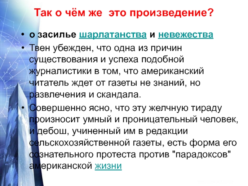 Это сайт презентаций, где можно хранить и обмениваться своими презентациями, докладами, проектами, шаблонами в формате PowerPoint с другими пользователями. Мы помогаем школьникам, студентам, учителям, преподавателям хранить и обмениваться учебными материалами.