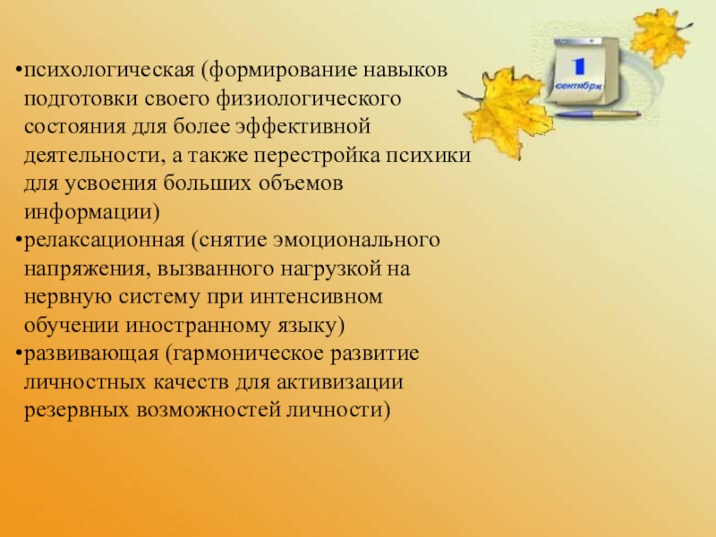 релаксационная (снятие эмоционального напряжения, вызванного нагрузкой на нервную систему при интенсивном обучении иностранному языку)