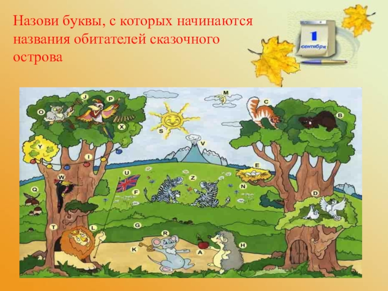 Слайд 23Назови буквы, с которых начинаются названия обитателей сказочного острова
