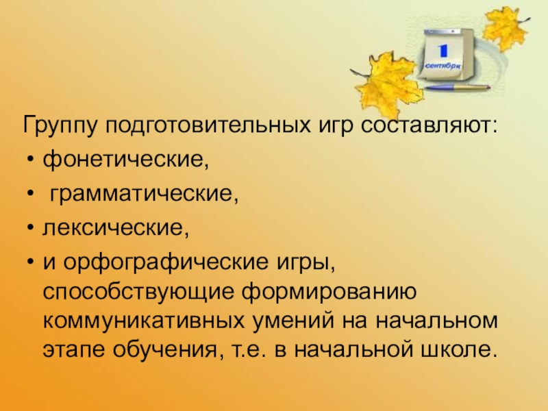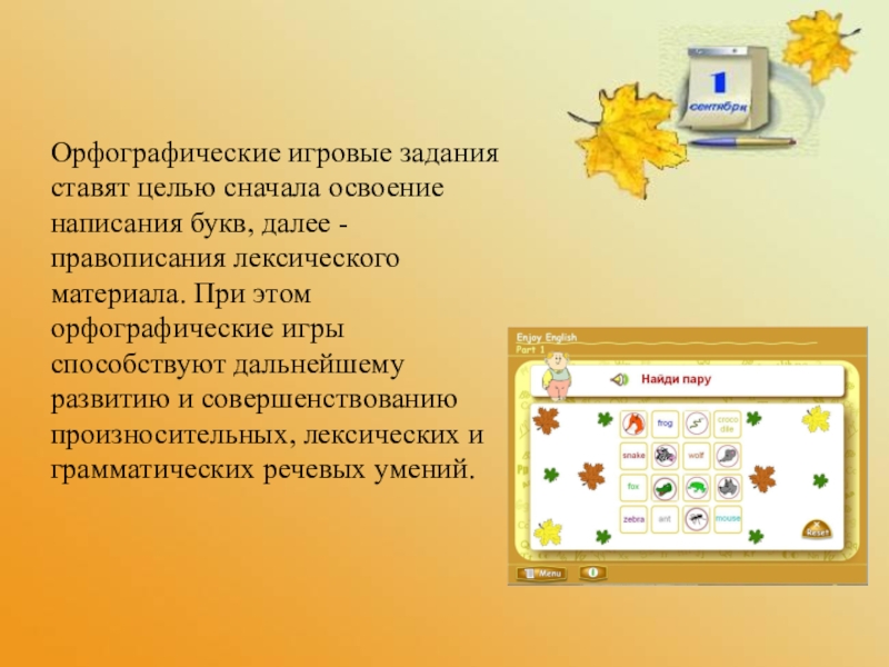правописания лексического материала. При этом орфографические игры способствуют дальнейшему развитию и совершенствованию произносительных, лексических и грамматических речевых умений.