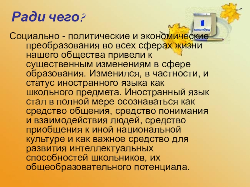 общества привели к существенным изменениям в сфере образования. Изменился, в частности, и статус иностранного языка как школьного предмета. Иностранный язык стал в полной мере осознаваться как средство общения, средство понимания и взаимодействия людей, средство приобщения к иной национальной культуре и как важное средство для развития интеллектуальных способностей школьников, их общеобразовательного потенциала.
