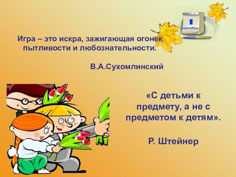 Слайд 2Игра – это искра, зажигающая огонек пытливости и любознательности.