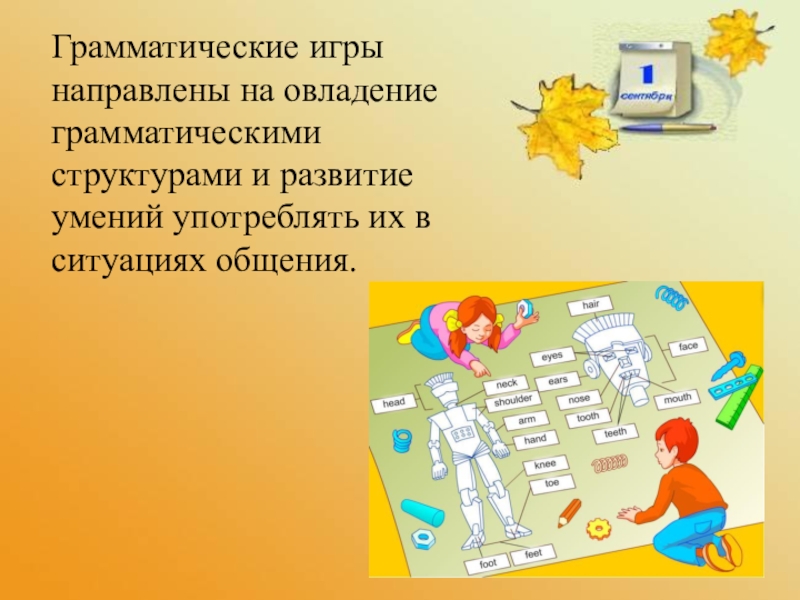 Слайд 13Грамматические игры направлены на овладение грамматическими структурами и развитие умений употреблять