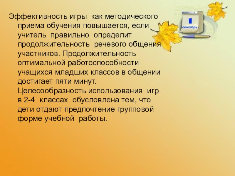 продолжительность речевого общения участников. Продолжительность оптимальной работоспособности учащихся младших классов в общении достигает пяти минут. Целесообразность использования игр в 2-4 классах обусловлена тем, что дети отдают предпочтение групповой форме учебной работы.
