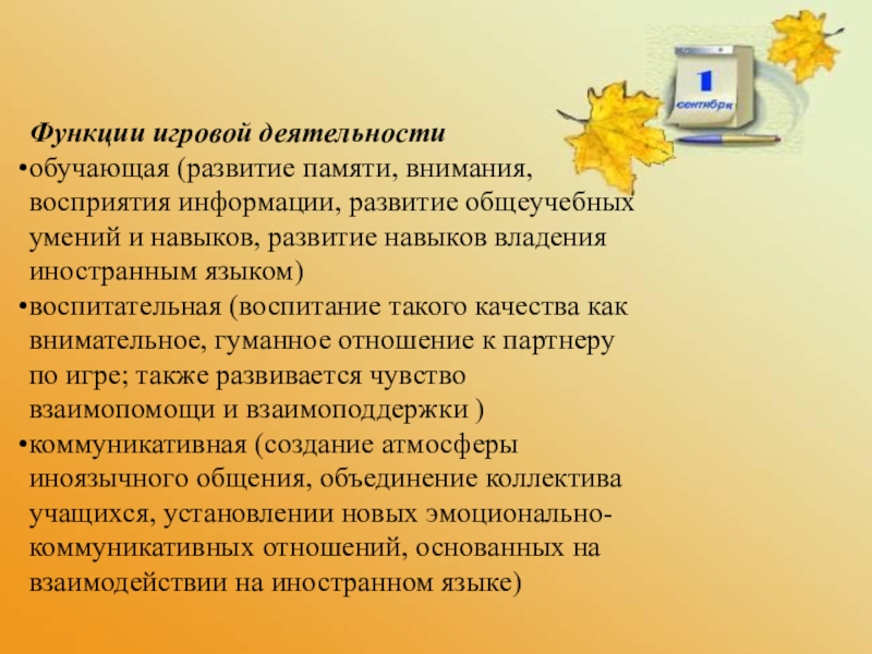 коммуникативная (создание атмосферы иноязычного общения, объединение коллектива учащихся, установлении новых эмоционально-коммуникативных отношений, основанных на взаимодействии на иностранном языке)