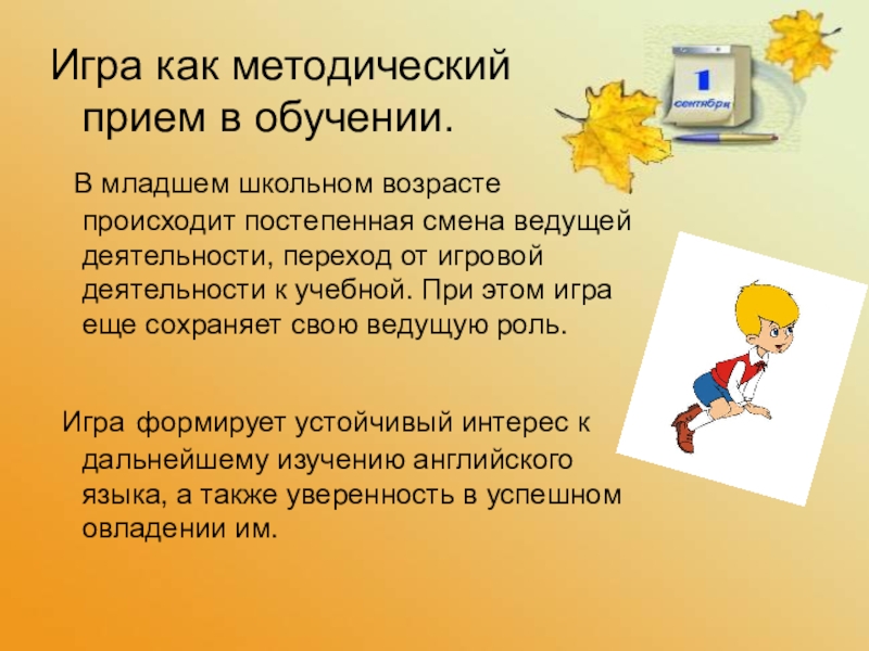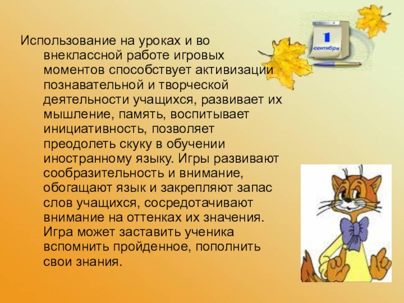 Слайд 6 Использование на уроках и во внеклассной работе игровых моментов способствует