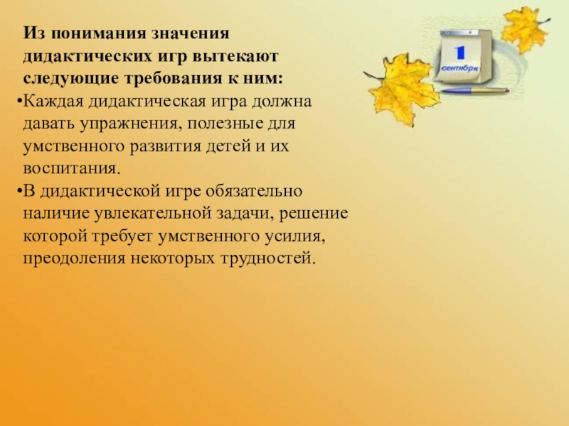 Слайд 19Из понимания значения дидактических игр вытекают следующие требования к ним: