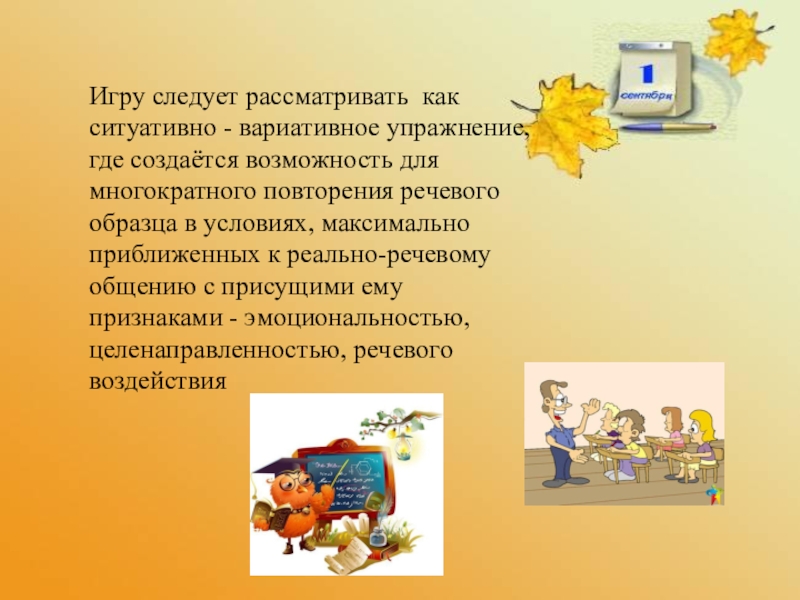 Слайд 7Игру следует рассматривать как ситуативно - вариативное упражнение, где создаётся возможность