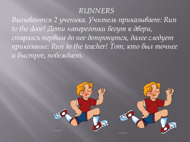 Вызываются 2 ученика. Учитель приказывает: Run to the door! Дети наперегонки
