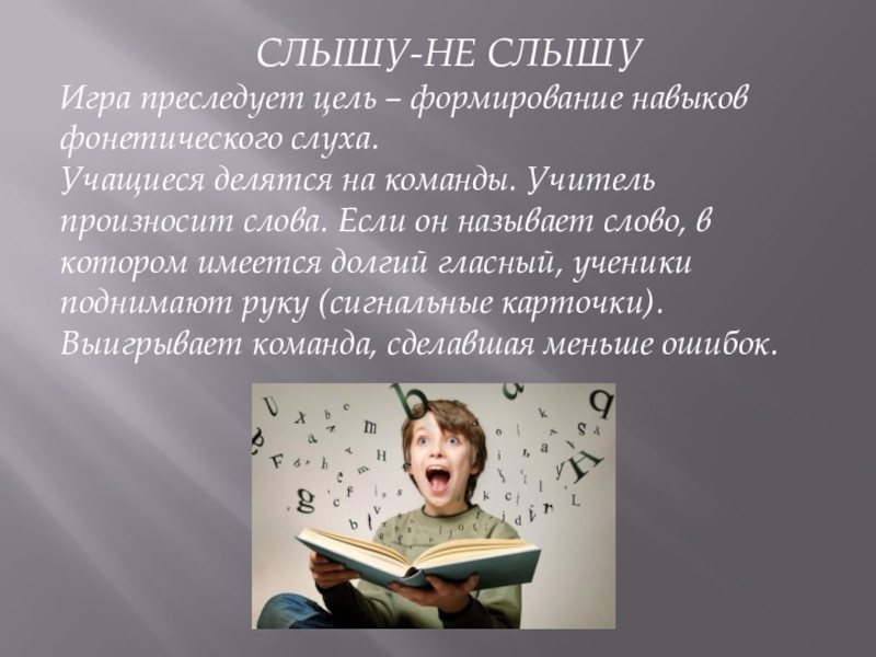на команды. Учитель произносит слова. Если он называет слово, в котором имеется долгий гласный, ученики поднимают руку (сигнальные карточки). Выигрывает команда, сделавшая меньше ошибок.