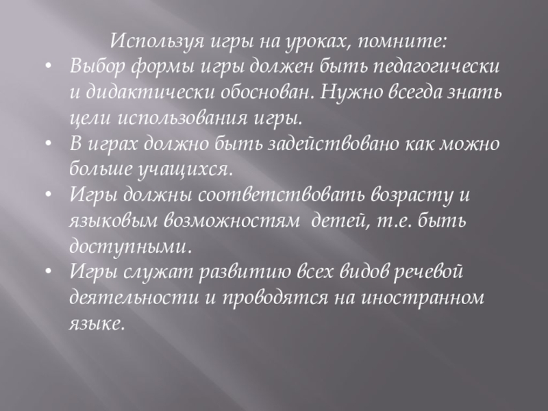 Игры должны соответствовать возрасту и языковым возможностям детей, т.е. быть доступными.