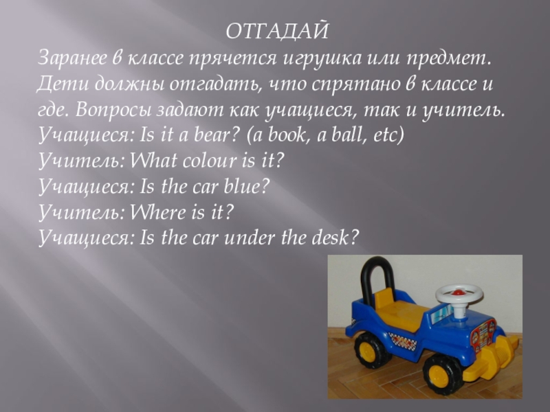 Заранее в классе прячется игрушка или предмет. Дети должны отгадать, что