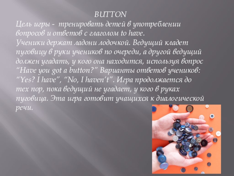 Ученики держат ладони лодочкой. Ведущий кладет пуговицу в руки учеников по очереди, а другой ведущий должен угадать, у кого она находится, используя вопрос “Have you got a button?” Варианты ответов учеников: “Yes? I have”, “No, I haven’t”. Игра продолжается до тех пор, пока ведущий не угадает, у кого в руках пуговица. Эта игра готовит учащихся к диалогической речи.