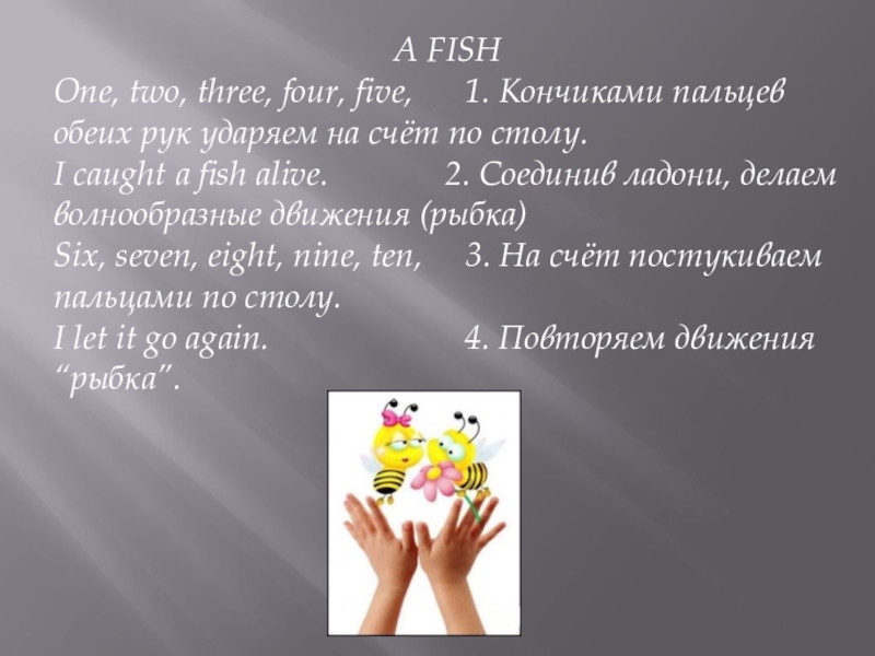 I caught a fish alive. 2. Соединив ладони, делаем волнообразные движения (рыбка)