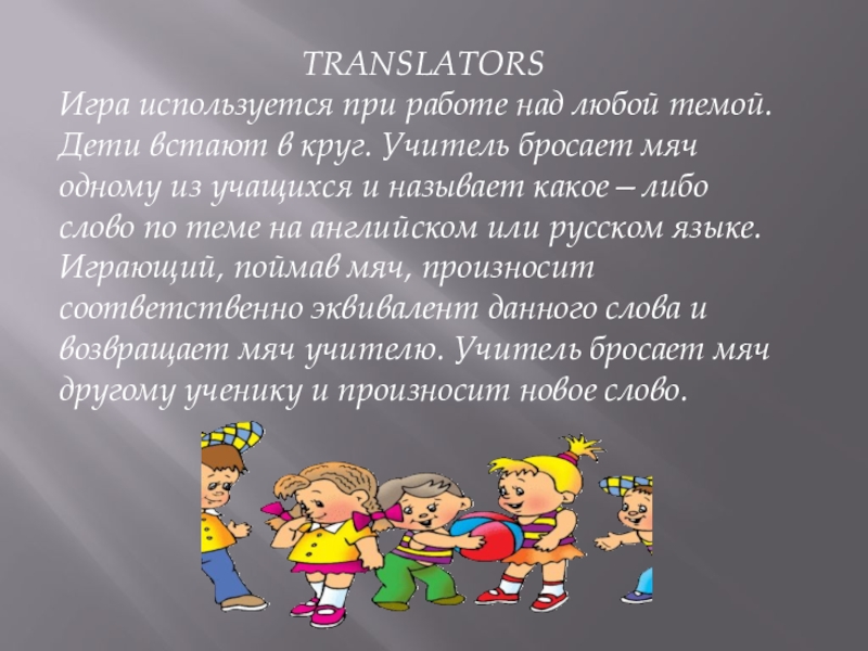 Учитель бросает мяч одному из учащихся и называет какое—либо слово по теме на английском или русском языке. Играющий, поймав мяч, произносит соответственно эквивалент данного слова и возвращает мяч учителю. Учитель бросает мяч другому ученику и произносит новое слово.