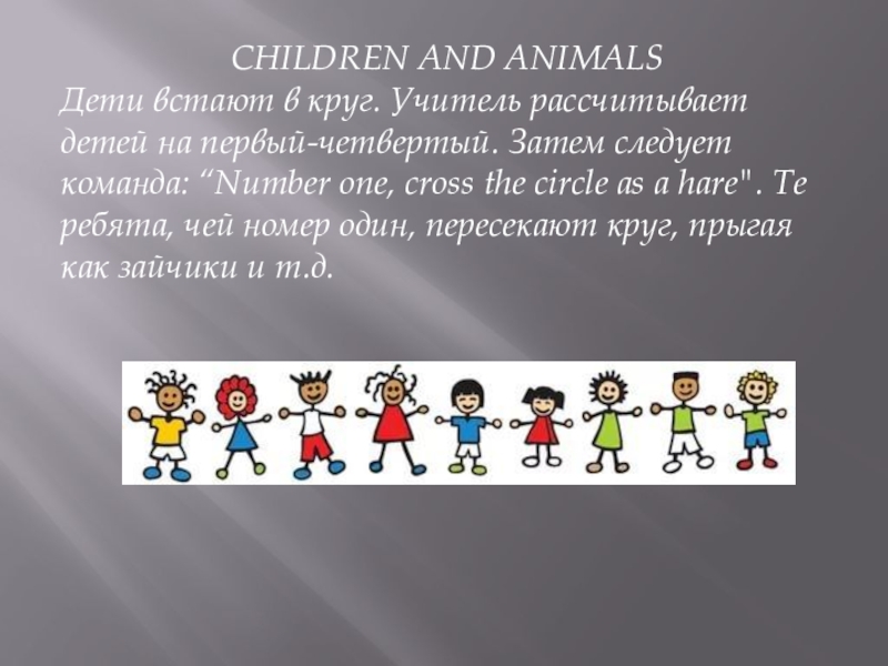 Затем следует команда: “Number one, cross the circle as a hare". Те ребята, чей номер один, пересекают круг, прыгая как зайчики и т.д.