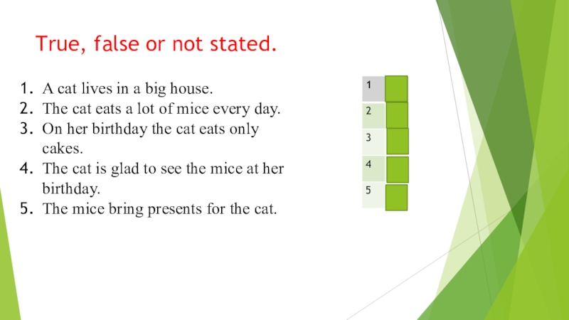 A cat lives in a small house. In the kitchen of the cat’s house live little mice. The cat is very big and every day she eats one or two mice. But on her birthday the cat does not eat mice. Every year all the mice in her house come to the cat’s birthday party. Of course, the cat is very glad to see the mice. They give her birthday presents: cakes, bottles of milk and interesting toys. The toys are made of paper and cotton. The cat likes the cakes and milk. She likes the toys too.
