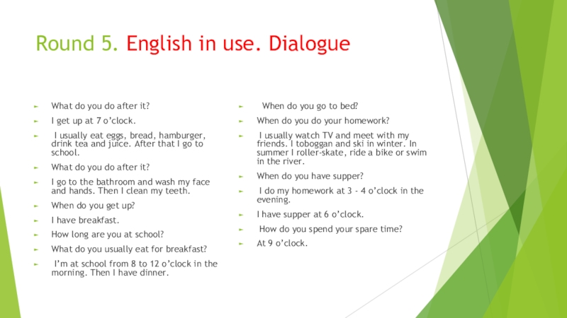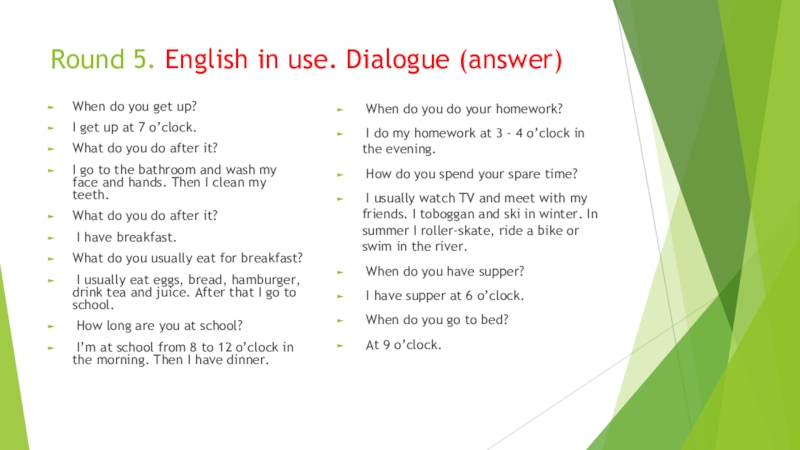 I usually watch TV and meet with my friends. I toboggan and ski in winter. In summer I roller-skate, ride a bike or swim in the river.