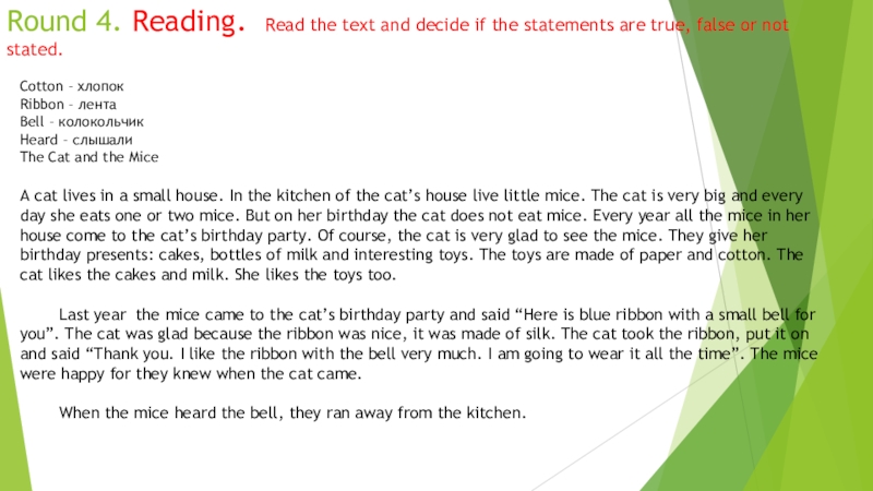 Last year the mice came to the cat’s birthday party and said “Here is blue ribbon with a small bell for you”. The cat was glad because the ribbon was nice, it was made of silk. The cat took the ribbon, put it on and said “Thank you. I like the ribbon with the bell very much. I am going to wear it all the time”. The mice were happy for they knew when the cat came.