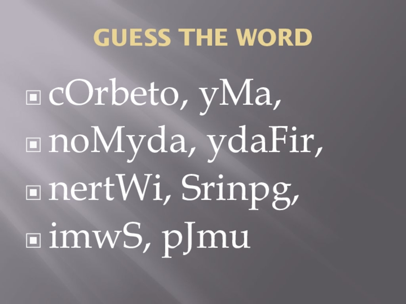 GUESS THE WORDcOrbeto, yMa,noMyda, ydaFir,nertWi, Srinpg,imwS, pJmu