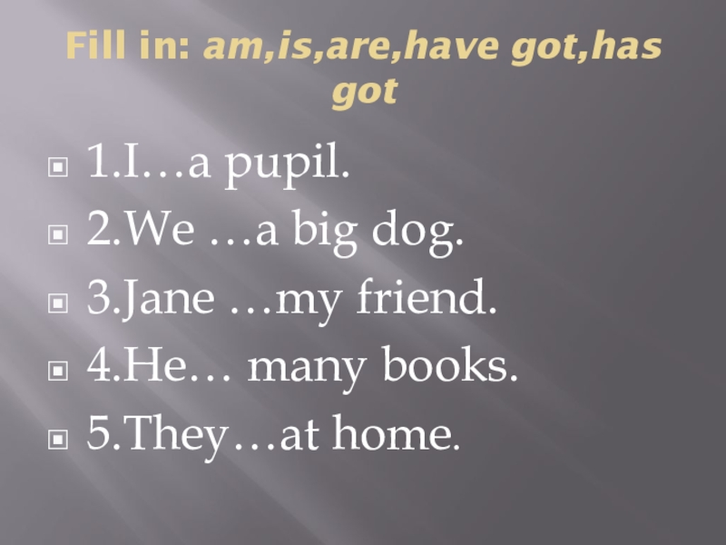 Fill in: am,is,are,have got,has got1.I…a pupil.2.We …a big dog.3.Jane …my friend.4.He… many books.5.They…at home.